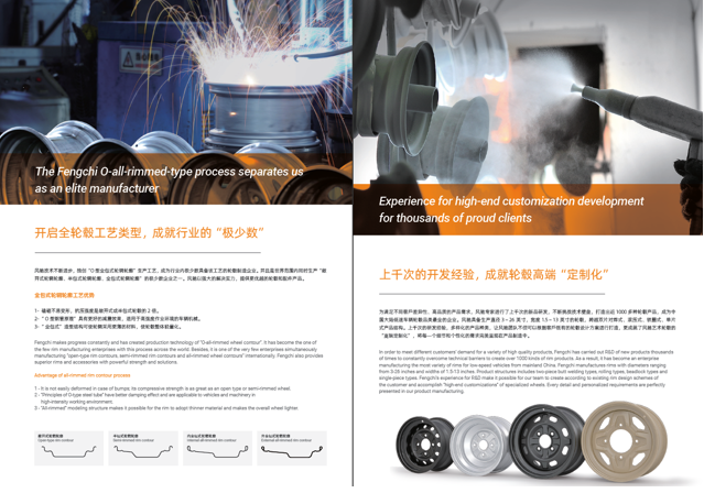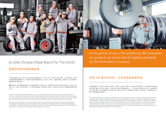 浙江風(fēng)馳機(jī)械有限公司,成立于1994年,伴隨著時間的飛逝,一直以工匠精神專注生產(chǎn)非公路低速車輛輪轂,在董事長潘衛(wèi)民的英明帶領(lǐng)下,風(fēng)馳以自信、沉穩(wěn)、堅實(shí)的腳步,企業(yè)逐步成為了世界500強(qiáng)合作伙伴、申請了企業(yè)獨(dú)有的輪輞品牌、創(chuàng)立了旗下5家子公司、獨(dú)創(chuàng)特殊工藝、產(chǎn)品革新?lián)Q代,一直以實(shí)現(xiàn)“引領(lǐng)低速車輪發(fā)展,為中國制造正名”的使命及成為“全球知名低速車輛制造企業(yè)的最佳戰(zhàn)略合作伙伴”為愿景而一直努力著。