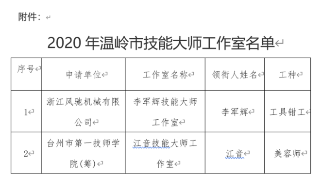 我司根據(jù)《關(guān)于深入實施2020年度溫嶺市技能大師工作室項目建設(shè)及考核評估的通知》(溫人社發(fā)〔2020〕59號)文件精神,通過自行推薦以及地方政府的大力支持,充分準備了相關(guān)申報資料,通過主管部門的初審以及專家的評審、部門審議和社會公示等評選環(huán)節(jié),我司最終順利通過評審,被評定為“李軍輝技能大師工作室”并于政府平臺公示。