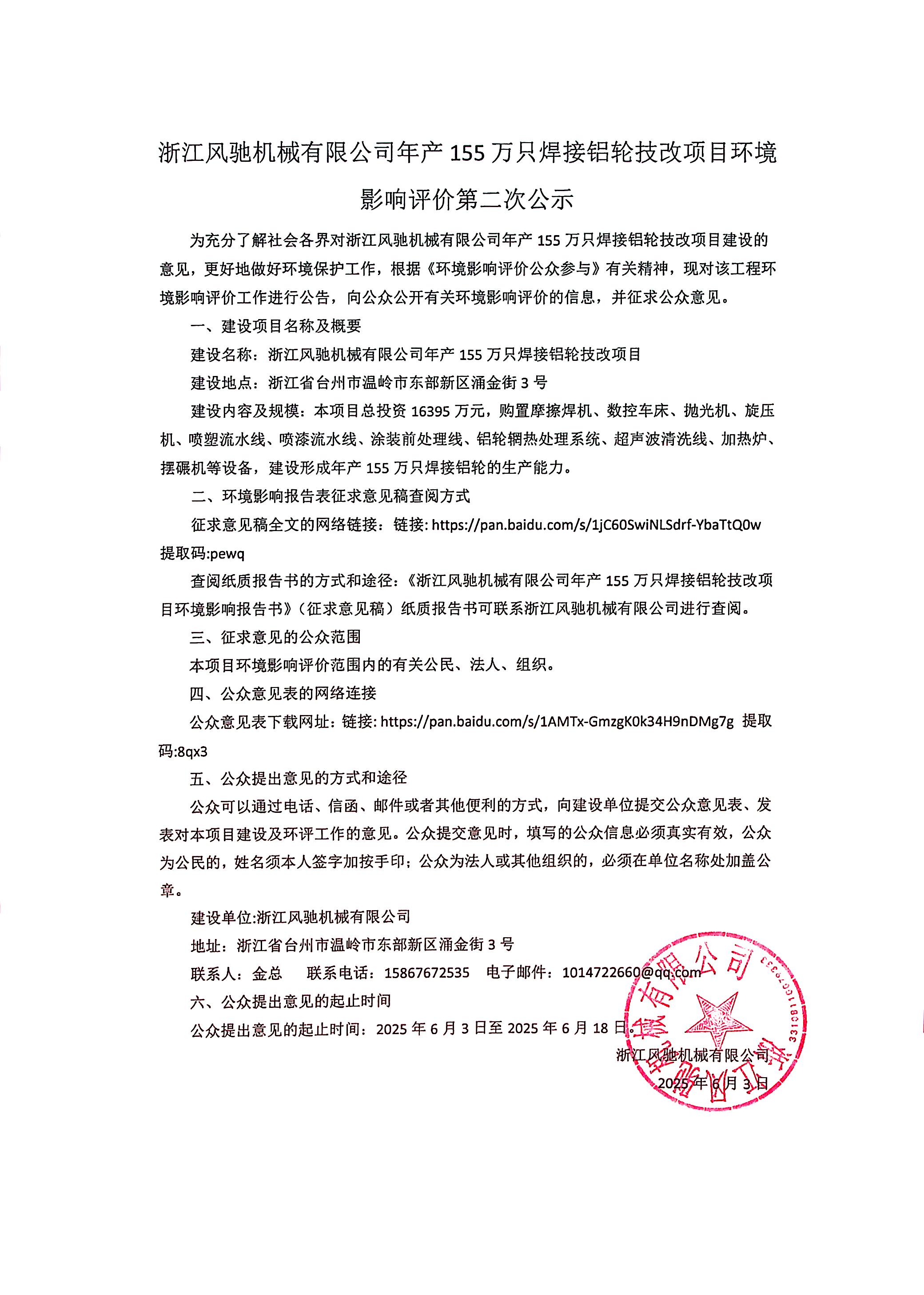 浙江風(fēng)馳機(jī)械有限公司年產(chǎn)155萬只焊接鋁輪技改項(xiàng)目環(huán)境影響評(píng)價(jià)第二次公示
